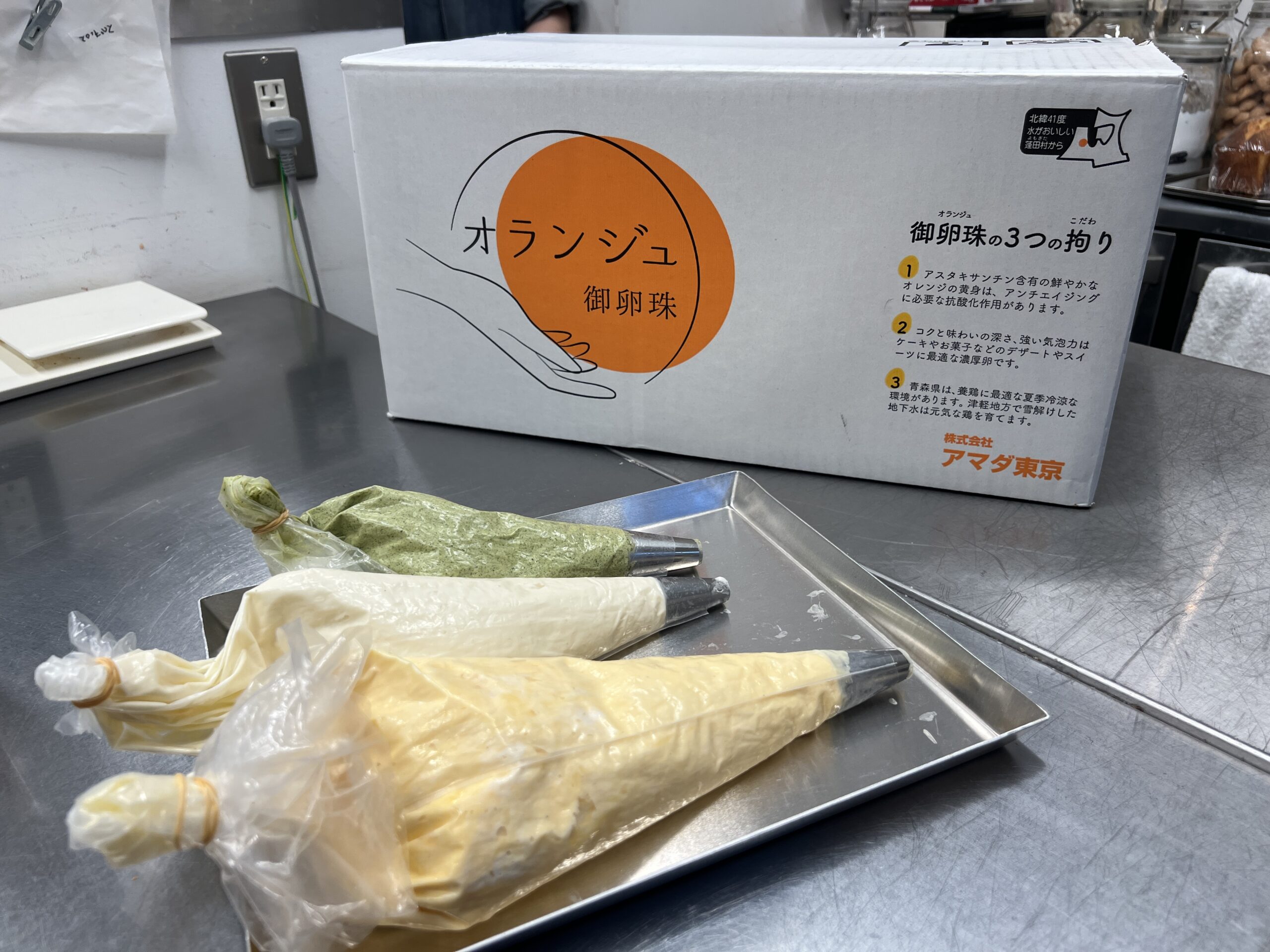 それで去年の末ぐらいからオランジュを使ってるんですが、確かに品質の良さと他の卵との違いをすごく感じています。また同じようにお客様が気づいてくれて。実はオランジュに変えた初日、その商品に対してお客様が「卵が違うね」ってすぐに気がついてくださったんです。